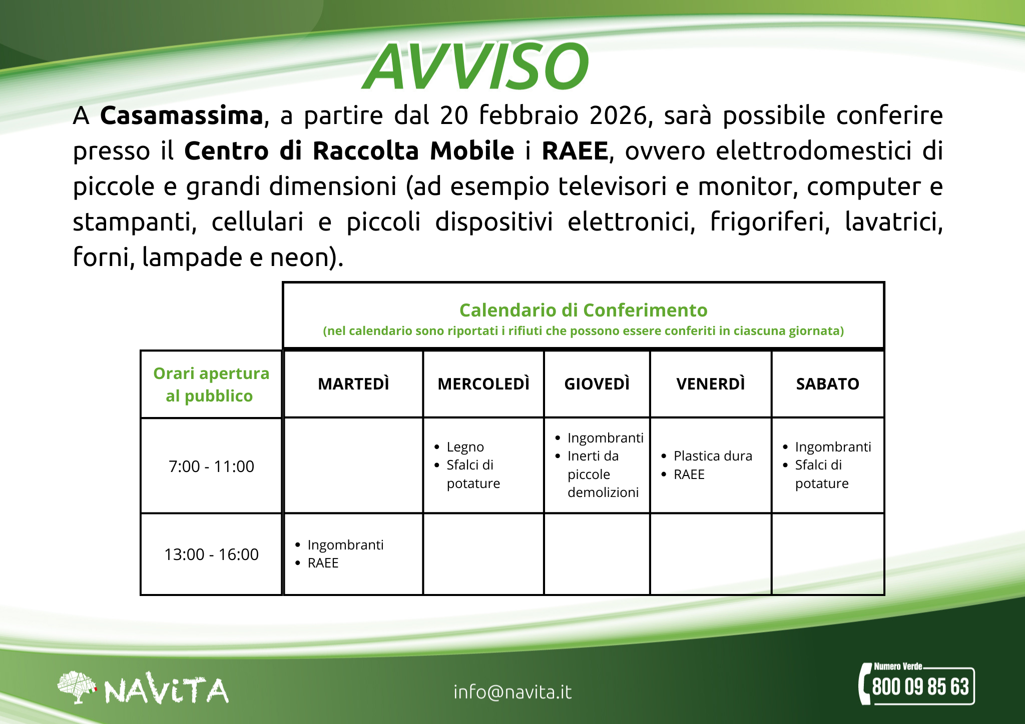 A Casamassima, a partire dal 20 febbraio 2026, sarà possibile conferire presso il Centro di Raccolta Mobile i RAEE, ovvero elettrodomestici di piccole e grandi dimensioni (ad esempio televisori e monitor, computer e stampanti, cellulari e piccoli dispositivi elettronici, frigoriferi, lavatrici, forni, lampade e neon).