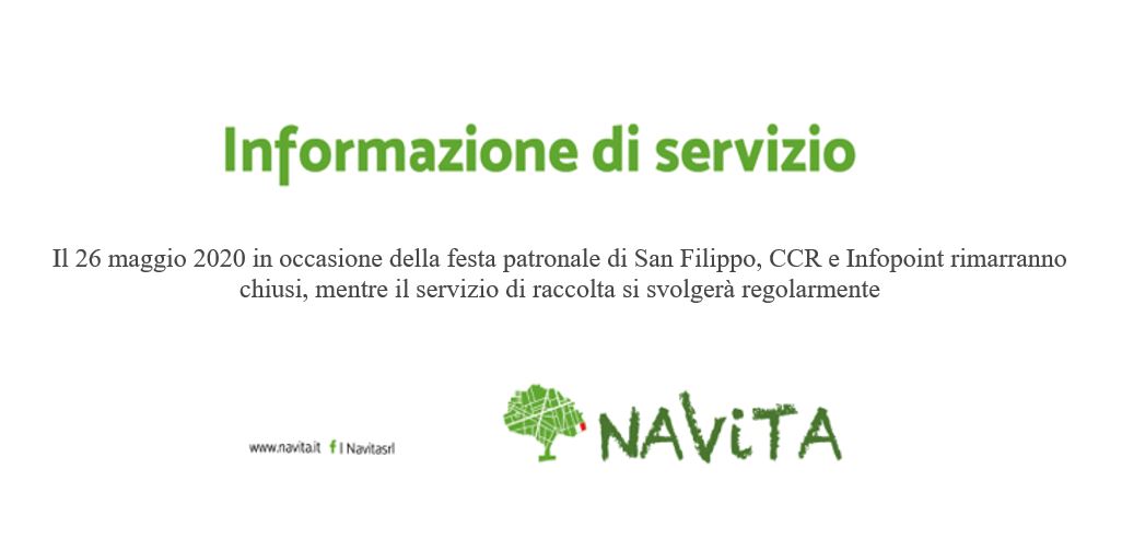 Il 26 maggio 2020 in occasione della festa patronale di San Filippo, CCR e Infopoint rimarranno chiusi, mentre il servizio di raccolta si svolgerà regolarmente.