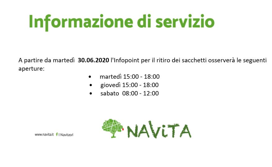 A partire da martedì 30.06.2020 l’Infopoint per il ritiro dei sacchetti osserverà le seguenti aperture: