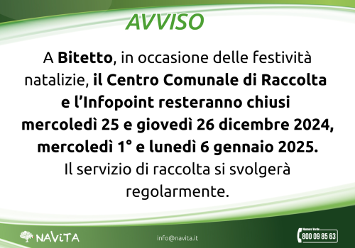 A Bitetto, in occasione delle festività natalizie, il Centro Comunale di Raccolta e l’Infopoint resteranno chiusi mercoledì 25 e giovedì 26 dicembre 2024, mercoledì 1° e lunedì 6 gennaio 2025.…