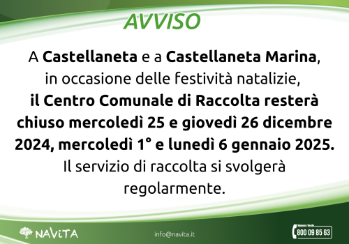 A Castellaneta e a Castellaneta Marina, in occasione delle festività natalizie, il Centro Comunale di Raccolta resterà chiuso mercoledì 25 e giovedì 26 dicembre 2024, mercoledì 1° e lunedì 6…