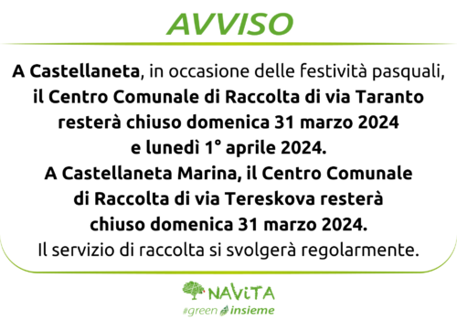 A Castellaneta, in occasione delle festività pasquali, il Centro Comunale di Raccolta di via Taranto resterà chiuso domenica 31 marzo 2024 e lunedì 1° aprile 2024. A Castellaneta Marina, il…