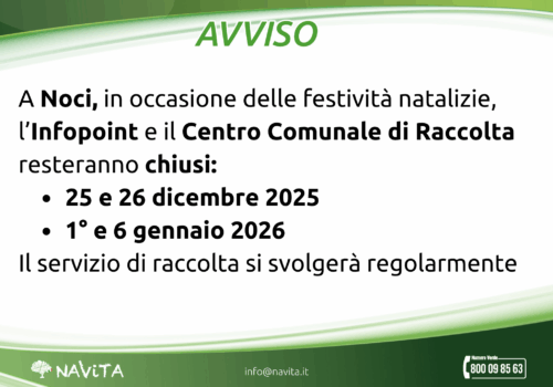 A Gioia del Colle, in occasione delle festività natalizie, l’Infopoint e il Centro Comunale di Raccolta resteranno chiusi: Il servizio di raccolta si svolgerà regolarmente