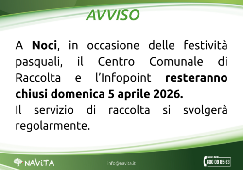 A Noci, in occasione delle festività pasquali, il Centro Comunale di Raccolta e l’Infopoint resteranno chiusi domenica 5 aprile 2026. Il servizio di raccolta si svolgerà regolarmente.