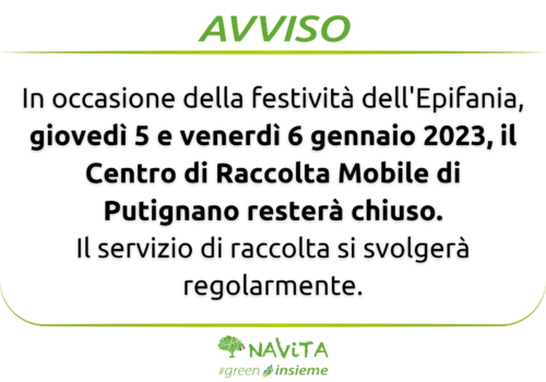 In occasione della festività dell’Epifania, giovedì 5 e venerdì 6 gennaio 2023, il Centro di Raccolta Mobile di Putignano resterà chiuso. Il servizio di raccolta si svolgerà regolarmente.
